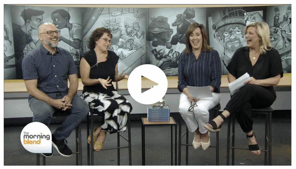 My husband and I had a lot of fun this morning The Morning Blend, the TV talk show on Milwaukee’s NBC station. My hubby, Jeff, is a professional illustrator and did the art for the entire book, including 13 black-and-white drawings within. Some of that art was highlighted on the big screens behind us during our talk.